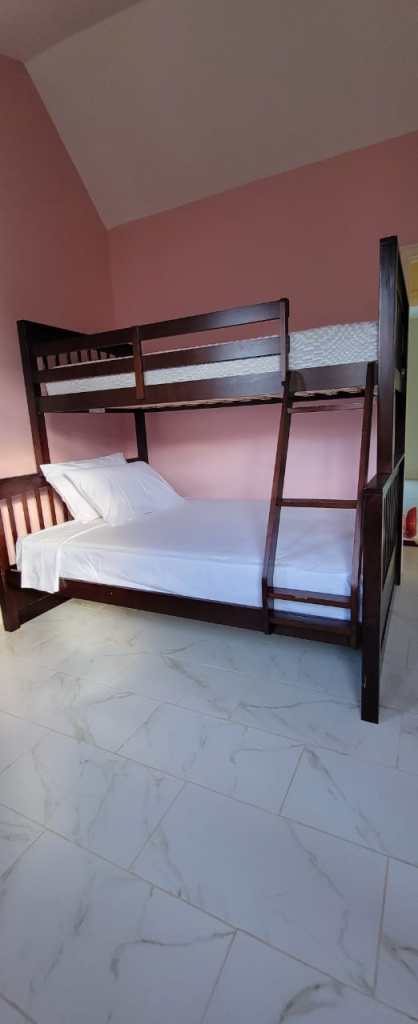 Room 6 comfortably sleeps 3 persons. The room features a bunk bed – single top bunk, double bottom bunk – private bathroom, hot and cold water, towels, soap, toilet paper, balcony with river view, fan, cable TV, WiFi, free parking and complimentary breakfast for 3 children or 3 adults. A 50% deposit is required to confirm all bookings.
